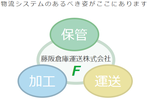 藤阪倉庫運送株式会社は物流を単なる物の流れではなく、システムと捉え、保管・荷役・包装・運送に至るまで一貫した流れを構築してきました。ロジスティクスの観点に立って、生産地と消費地をより円滑により効率的に結び付けるビジネスを展開しています。 そして保管・加工・運送業務を3つの柱にお客様のメリットを徹底して追求します。